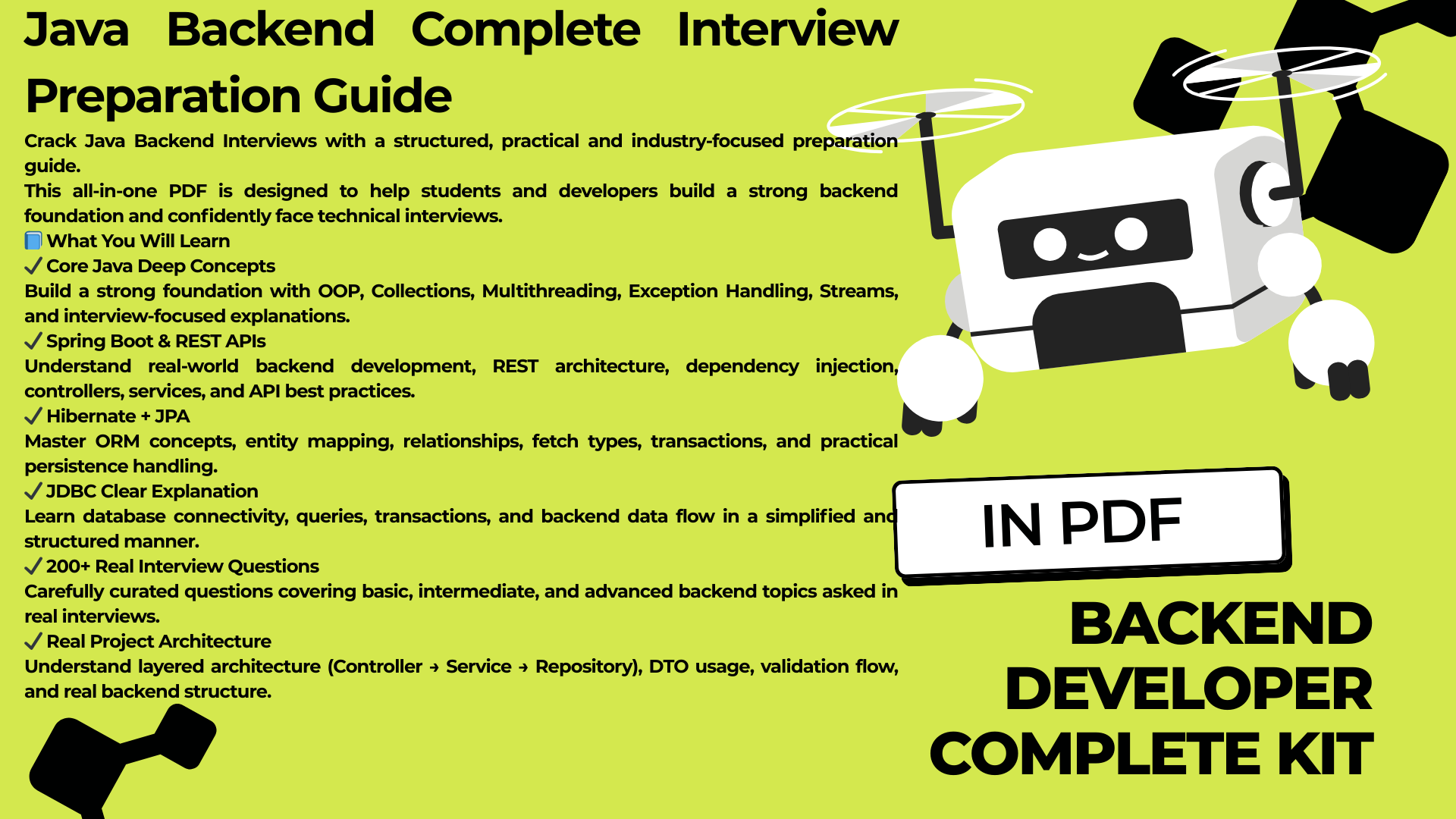This PDF includes Core Java concepts, Spring Boot, REST API, Hibernate, JDBC, Microservices basics, and 200+ real interview questions with answers.